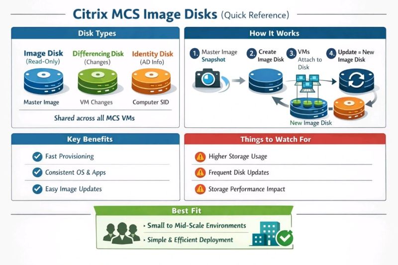 Citrix Machine Creation Services (MCS) משתמש במבנה דיסקים חכם שמפריד בין מערכת ההפעלה, השינויים של כל מכונה וזהות המחשב. ההפרדה הזו מאפשרת ניהול צפוי, קל לניקוי ומהיר לשינוי, ולכן MCS נחשב לפתרון פריסה יעיל ופשוט יחסית בסביבות VDI ו‑Published Desktops.